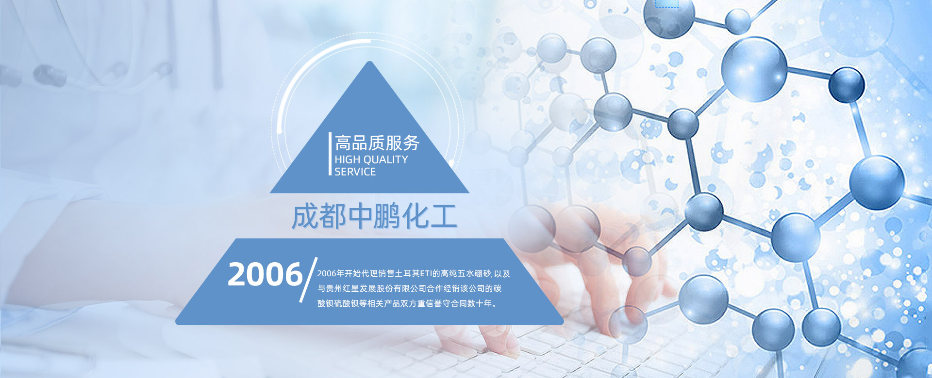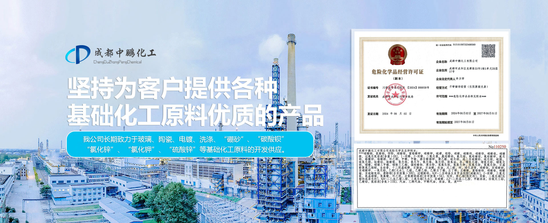 成都中鵬化工有限公司成立于2001年,位于成都市新都區木蘭木名商塑化城2棟11號,公司成立16年以來,一直堅持為客戶提供各種基礎化工原料的產品。我公司長期對于玻璃、陶瓷、電鍍、洗滌、“硼砂”、“碳酸鋇”、“氯化鋅”、“氯化鉀”、“硫酸鋅”等基礎化工原料的開發(fā)供應。 公司現在員工上百人,在全國擁有多個營銷體系和完善的售后服務體系,長期以來,通過為客戶提供各種基礎化工原料的產品,形成了良好的合作關系...